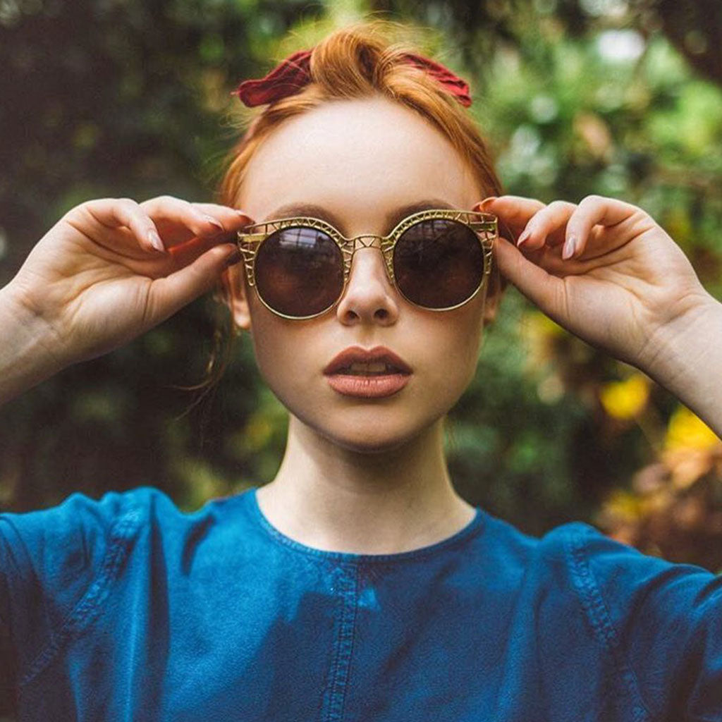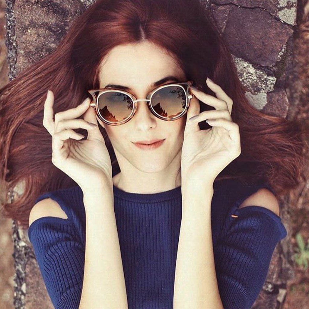 Semi-rimless round cat eye silhouette that features a unique double bridge with a metal cross that runs along the top of the frame. Stylish mod fashion cat eye that presents a very unique look this season. Made with a metal and plastic based frame, metal hinges, and UV400 protected lenses.